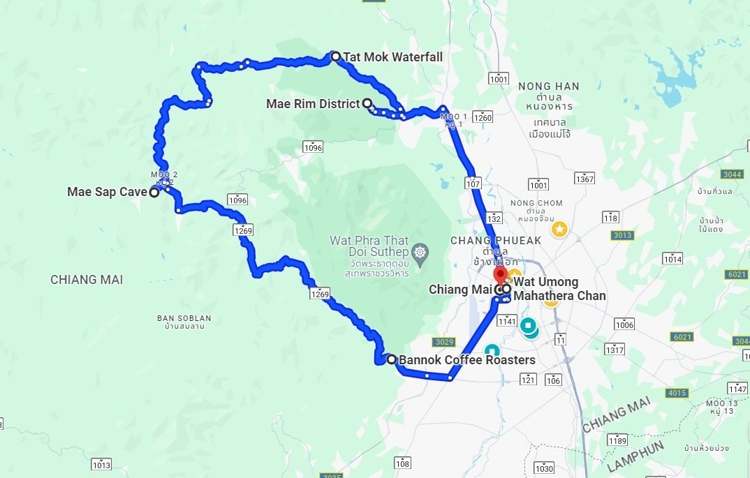 Set off at 9 AM from our base, heading northwest to Wat Umong — a 700-year-old tunnel temple — with a coffee stop nearby. From there, ride the Samoeng Loop anticlockwise via backroads through rural farmland and forested hills, arriving at Mae Sap Cave around midday.
